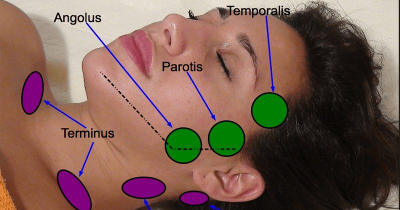 E’ un fluido molto simile al sangue, che scorre più lentamente di esso( poi capirete perché ve lo specifico), composto da acqua, sali minerali, proteine e linfociti che attraversa tutti i distretti corporei e trascina con se tossine e scorie che si accumulano nei tessuti. Questa linfa passa per delle “stazioni” chiamate gangli linfatici dove “scarica” le tossine catturate nel suo percorso e torna a circolare pulita per ripetere tutto ciò all’infinito. Al contrario del percorso del sangue, la linfa è “spinta” dalla contrazione dei nostri muscoli, quindi se questi non si contraggono frequentemente la linfa potrebbe ristagnare facilmente causando edemi( es. la cellulite a stadi gravi) o rigonfiamenti( es. le borse sotto gli occhi). Per evitare tutto ciò si effettuano dei movimenti che favoriscono il percorso della linfa che possono essere effettuati con le mani oppure con degli accessori come quelli che vedremo oggi. Un buon massaggio linfodrenante aiuta anche a diminuire le impurità della pelle a ridurre l’infiammazione da acne. Una cosa fondamentale però per la buona riuscita di un massaggio linfodrenante in generale è l’attivazione del Terminus, che è considerato la stazione linfatica finale(dove scaricano tutte le altre) che è importante attivare prima di ogni massaggio in modo da favorire lo scarico. Questa stazione si trova alla base del collo, a livello delle fosse clavicolari. Qua sotto vi metto le stazioni del viso dove far fluire i liquidi durante il massaggio. Sia chiaro io non mi sostituisco assolutamente agli specialisti, vi voglio solo illustrare come usare al meglio gli accessori, perché io personalmente ne sto traendo ottimi risultati, specialmente nella zona del contorno occhi dove soffro di borse causate dalla sinusite cronica.
