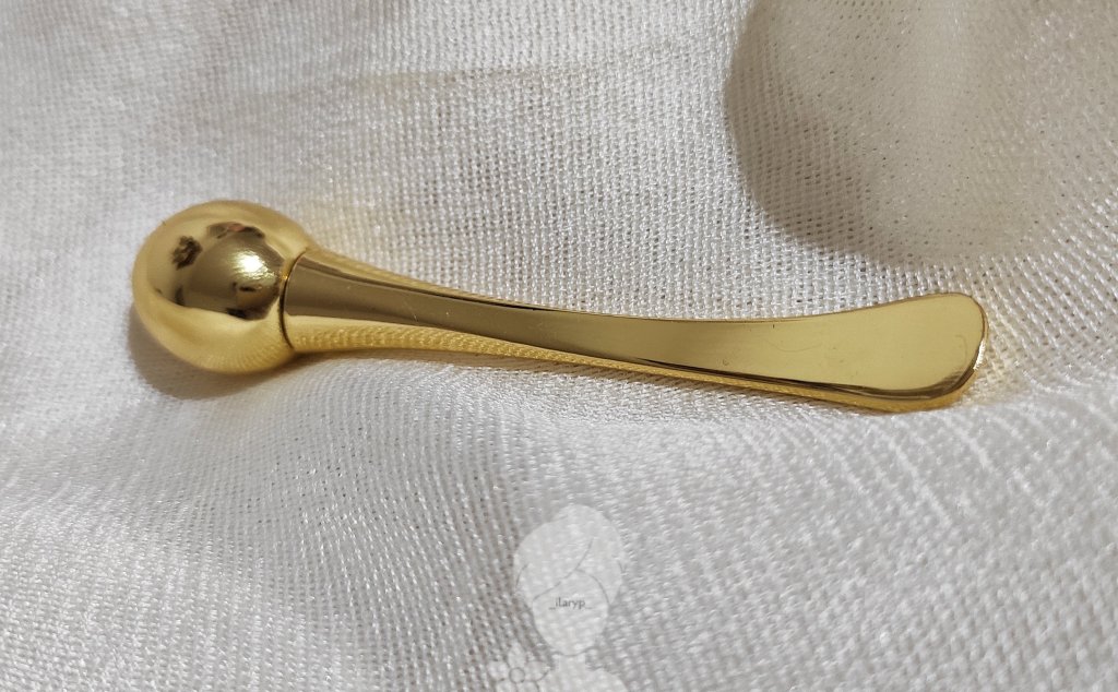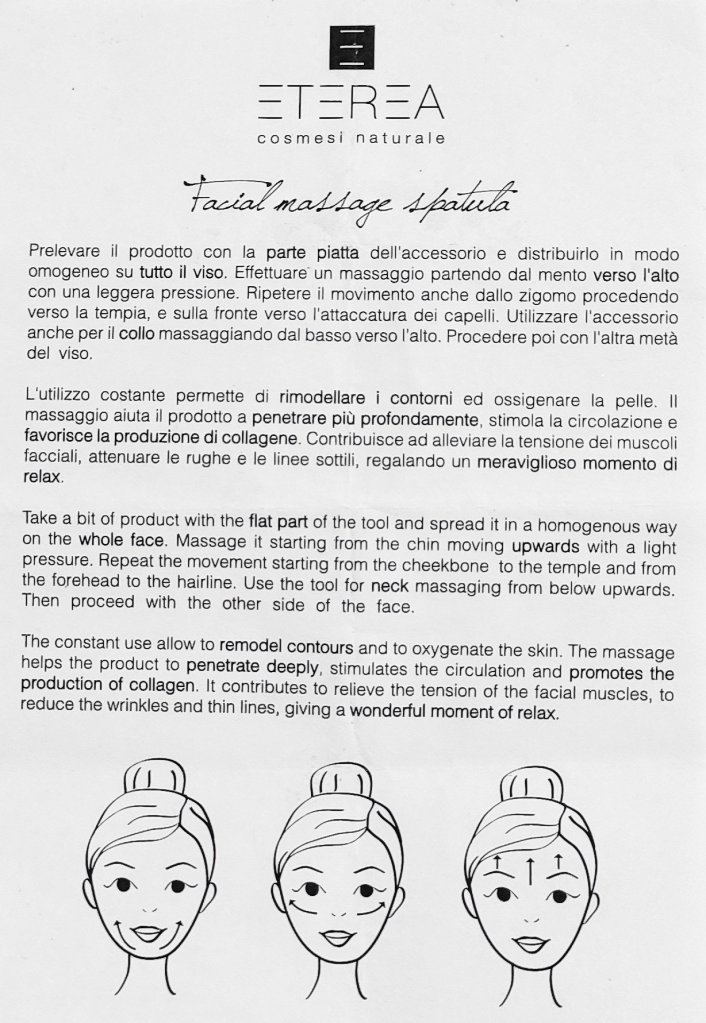 Questo accessorio è stato creato sia per prelevare i prodotti dalle confezioni in barattolo ( ricordatevi di non immergere mai le dita nei prodotti!) sia per effettuare un massaggio rilassante e drenante a viso e collo. E’ realizzato in materiale metallico anallergico ed è contenuta in una comoda sacchetta per poterla riporre dopo l’uso. Sempre nella confezione si trova un foglietto illustrativo con dei consigli su come usare al meglio la spatula.