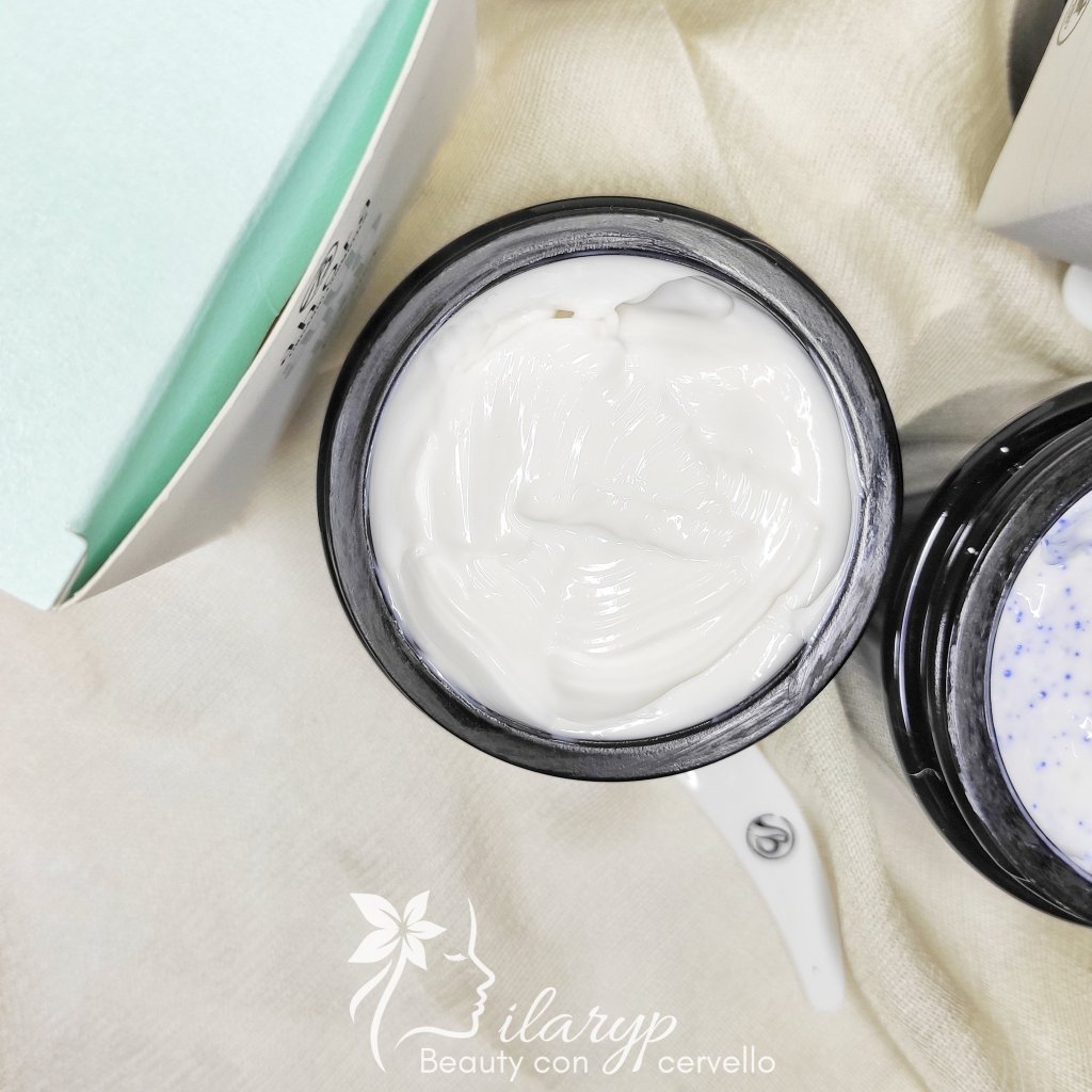 Partiamo dalla texture, molto cremosa e facile da stendere; troviamo la palettina per prelevare il prodotto, io la applico con un pennello da maschera perché lo preferisco rispetto alle mani; colore bianco candido e profuma di pulito, non so dirvelo in altro modo. Per me non ha un profumo dominante ed è talmente delicato che è un piacere sniffarla!