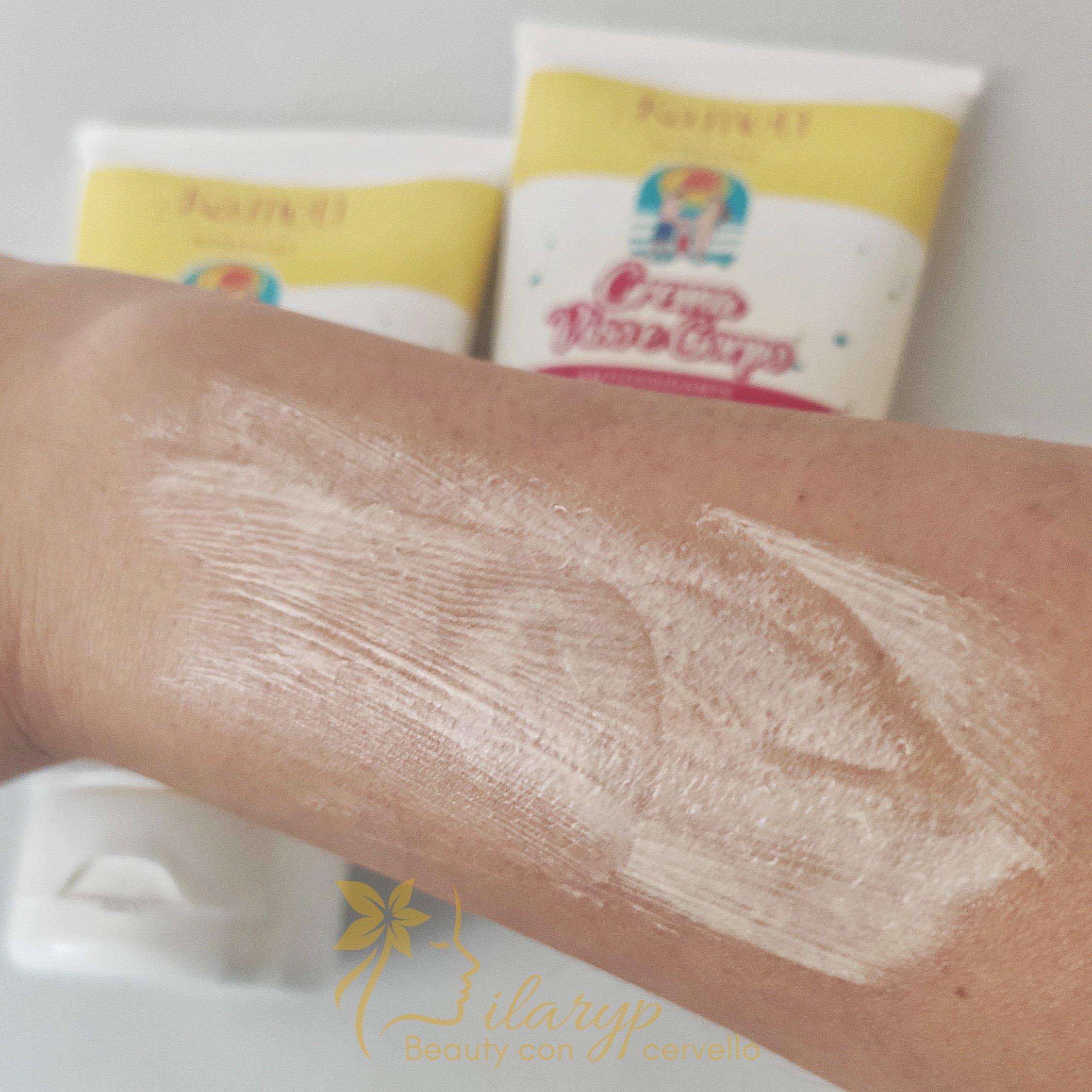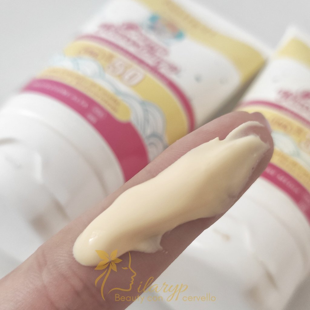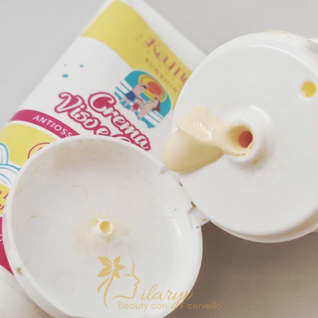 La texture è cremosa e si spalma facilmente , il profumo è quello tipico di estate( cocco,monoi). Il colore è sul giallo per via del beta carotene, che ahimè tende a macchiare la roba chiara, quindi non usatela con costumi bianchi o comunque chiari perche rischiate che restino macchiati.