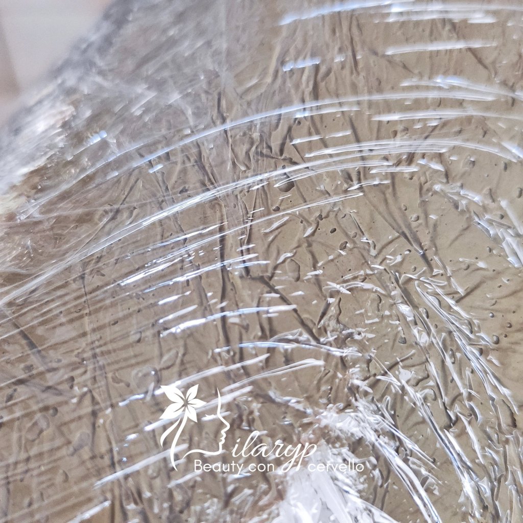 Cosa fondamentale avvolgere la parte dove avete applicato il prodotto bene con la pellicola per non far seccare il prodotto. Tenere almeno 40 minuti e poi lavare con acqua tiepida.