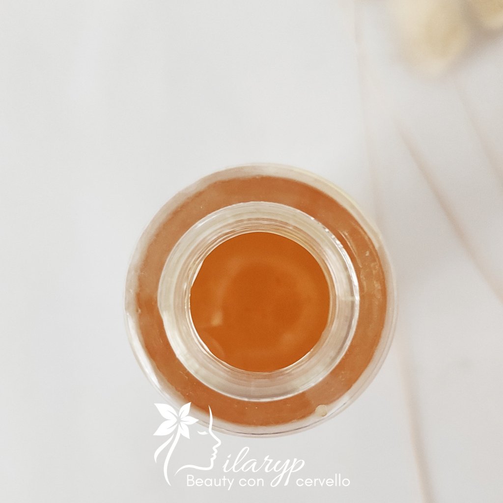 La sua texture è abbastanza liquida, il colore è sul giallo con delle pagliuzze luminose. L’odore è lo stesso di tutti i prodotti capelli del brand, che io personalmente amo. Non so descriverlo, è profumo di crema e di pulito.