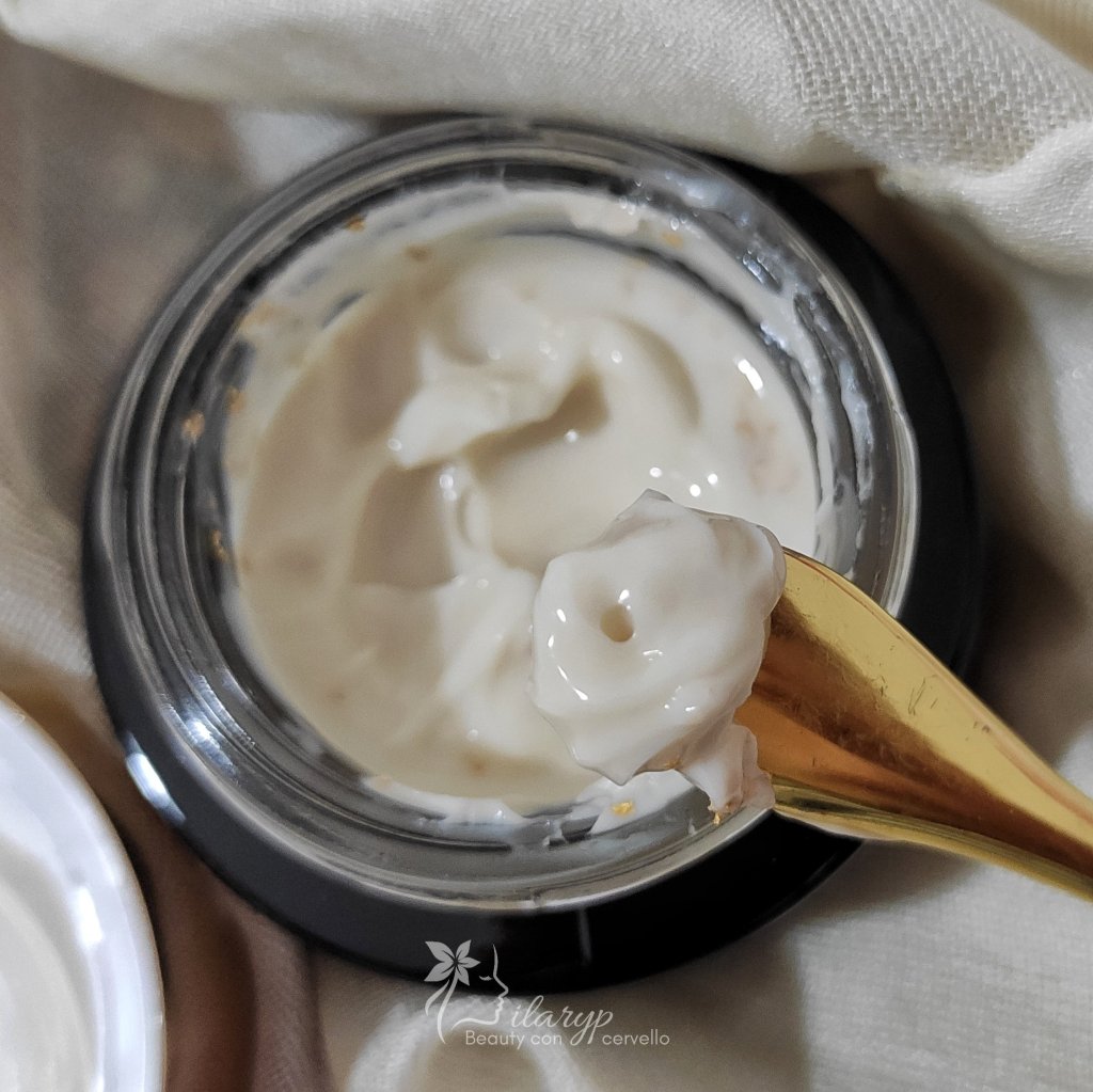 Lista ingredienti: Lavandula Angustifolia Water*, Oryza Sativa Bran Oil, Propanediol, Cetyl Alcohol, Glyceryl Stearate, Glycerin*, Butyrospermum Parkii butter*, Cetearyl Glucoside, Olus oil, Ethilhexylpamitate, Coco Caprilate, Dicaprylyl Carbonate, Undecane, Tridecane, Caprylic/Capric Triglycerides, Aqua, Glycerin, Acetyl Hexapeptide-8, Pentapeptide18, hydrolyzed Verbascum thapsus flower, Saccharide Isomerate (active), Hyaluronic Acid, Hydrolyzed Hyaluronic acid, Chamomilla Recutita Flower Water*, Sodium Hyaluronate, Lactobacillus Ferment, Avena sativa Kernel Extract, Glycosphingolipids, glycolipids, Phytosterols, Olive Glycerides, Ceramide NP, Aronia Melanocarpa Fruit Extract, Jasminium Officinale Flower Extract, Saccharomyces Ferment Lysate Filtrate, Dipalmitoyl Hydroxyproline, Carrageenan, Glucose, Glyceryl Caprylate, Pullulan,Oryza Sativa(Rice) Starch, Prunus Armeniaca Kernel Oil*, Caprylic/Capric Triglycerides, Myrciaria Dubia Fruit Extract, Malpighia Glabra Fruit Extract, Sambucus Nigra Flower Extract*, Aristotelia chilensis fruit extract, Sorbitol,Betaine, Euterpe oleracea oil, Calodendrum Capense Seed Oil, Gold, Pongamia glabra seed oil*, Calophyllum inophyllum seed oil*, Bisabolol, Ascorbyl Palmitate, Panthenol, Tocopherol, Tocopheryl Acetate, Sodium Stearoyl Glutamate, Cetyl Palmitate, Hydrogenated Vegetable Oil, Candelilla Cera, Cetearyl Alcohol, Citric Acid, Caprylyl Glycol, Sodium Citrate, sodium benzoate, potassium sorbate, Phytic Acid, Dehydroacetic acid, benzyl alcohol, Sodium hydroxide, Fragrance (Parfum).