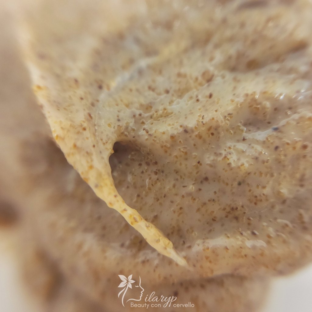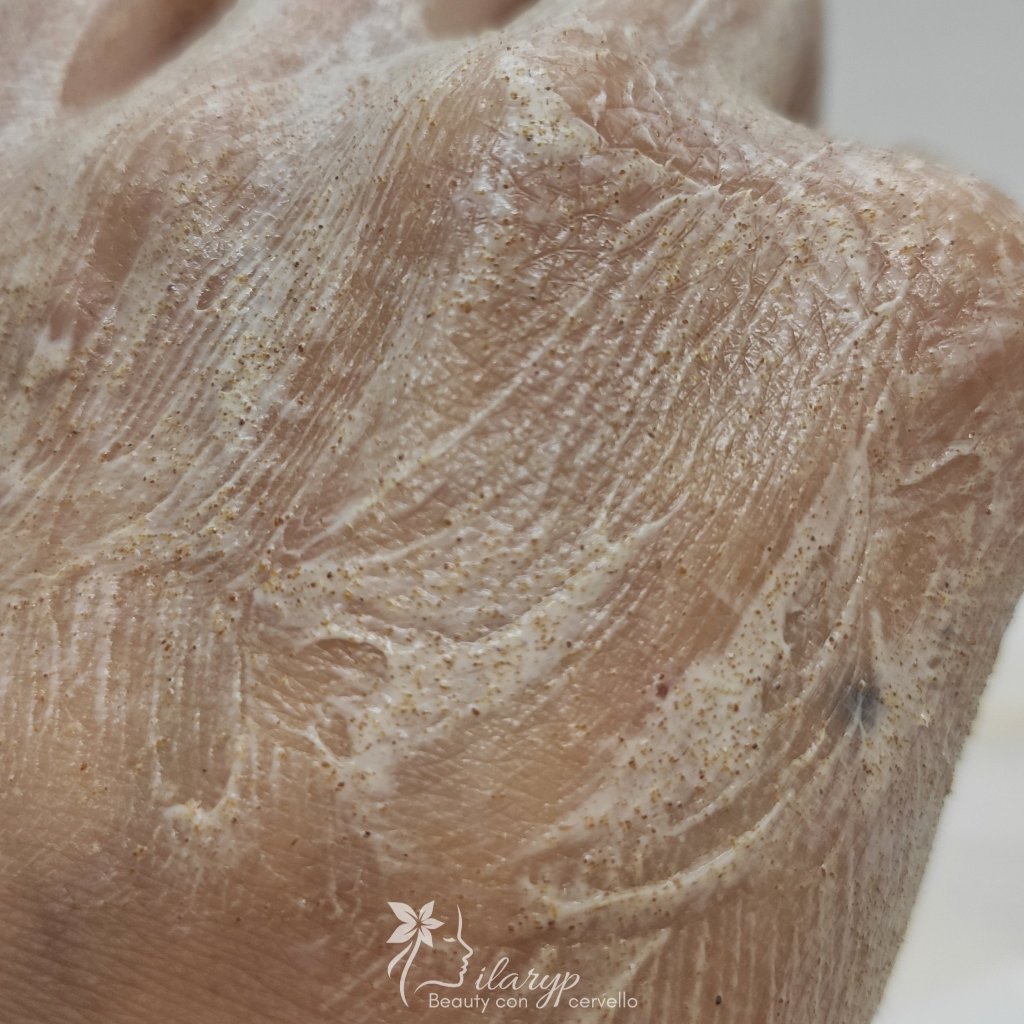 La sua texture è cremosa, non è per niente aggressivo nonostante ci siano i granuli ( molto fini e lisci); il profumo è abbastanza erboso dato dagli ingredienti al suo interno. La pelle dopo l’uso risulta molto morbida, liscia e luminosa. Vi consiglio di insistere nelle zone spesse come talloni, gomiti,ginocchia e schiena per favorire la rimozione delle cellule morte in modo ottimale.